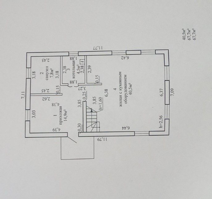 1-этаж: посторная прихожая 14,9 кв.м.,сан.узел 7,8 кв.м., котельная и кухня-гостиная 40,5 кв.м.