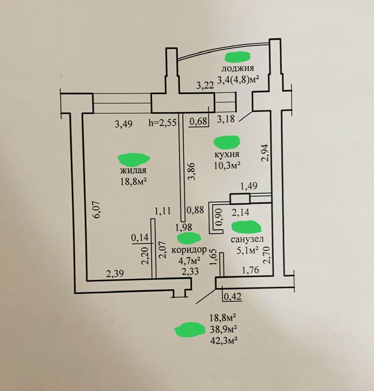 Общая площадь квартиры 42.3 кв.м (по СНБ)., жилая – 18.8 кв.м, площадь кухни – 10.3 кв.м.